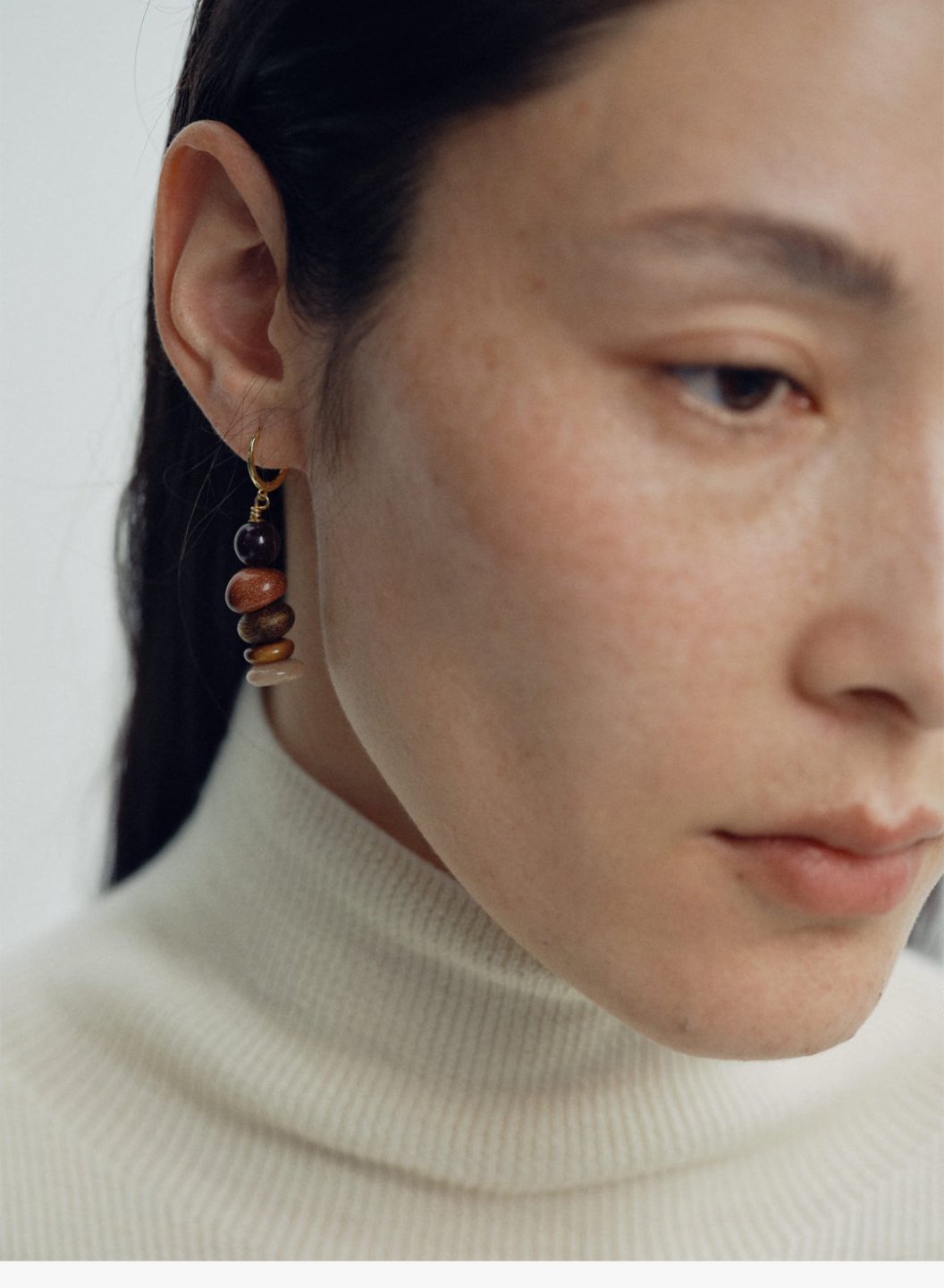 Wishing tower beads: Five natural stones and agarwood are stacked like mani stone piles, and golden sand stone is called "wishing stone" in Indian folk and turned into earrings to convey good wishes.