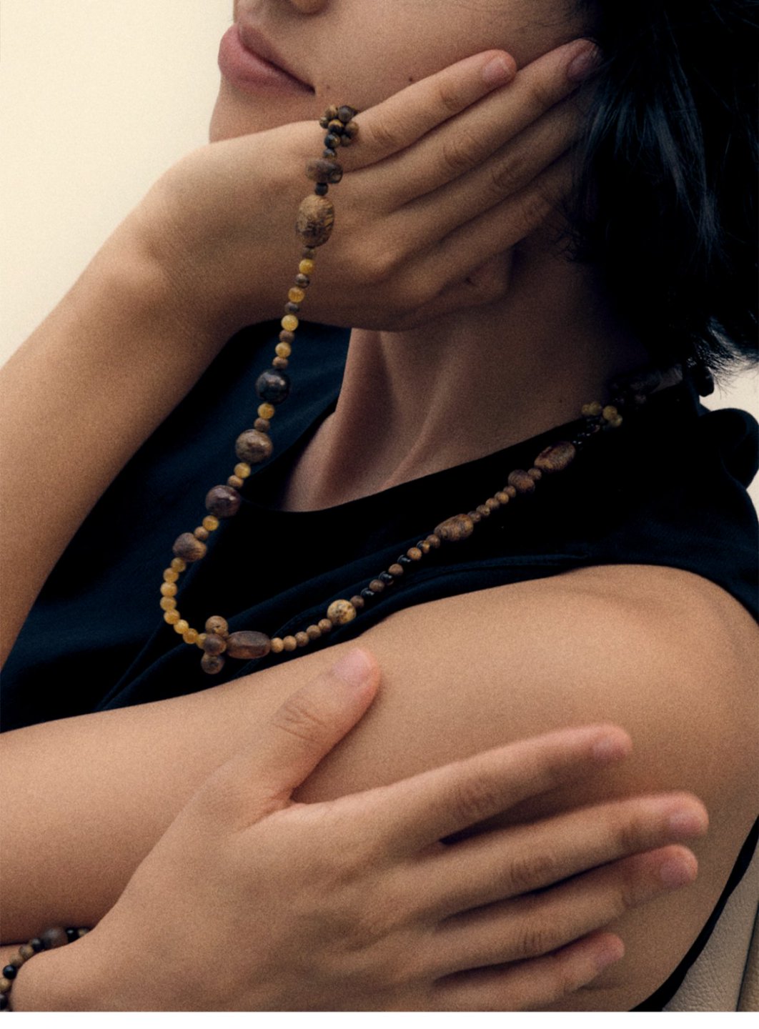 Light and mature outfit: The slender chain is interspersed with geometric beads, and the bright yellow stone quietly brightens up the overall outfit"