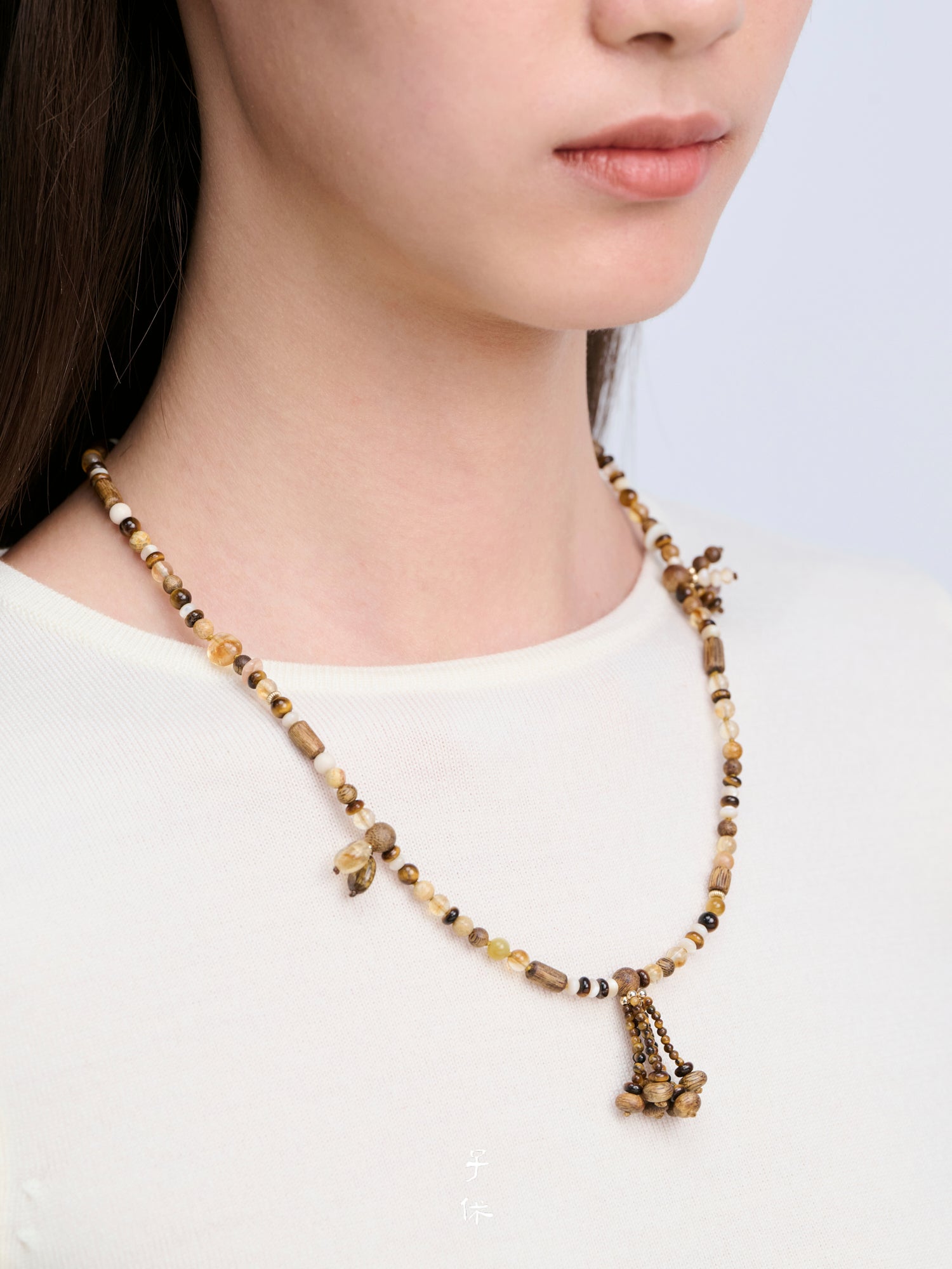 Wooden jewelry made of agarwood planted for over seven years and other natural materials; the necklace emits a natural woody fragrance during wear.